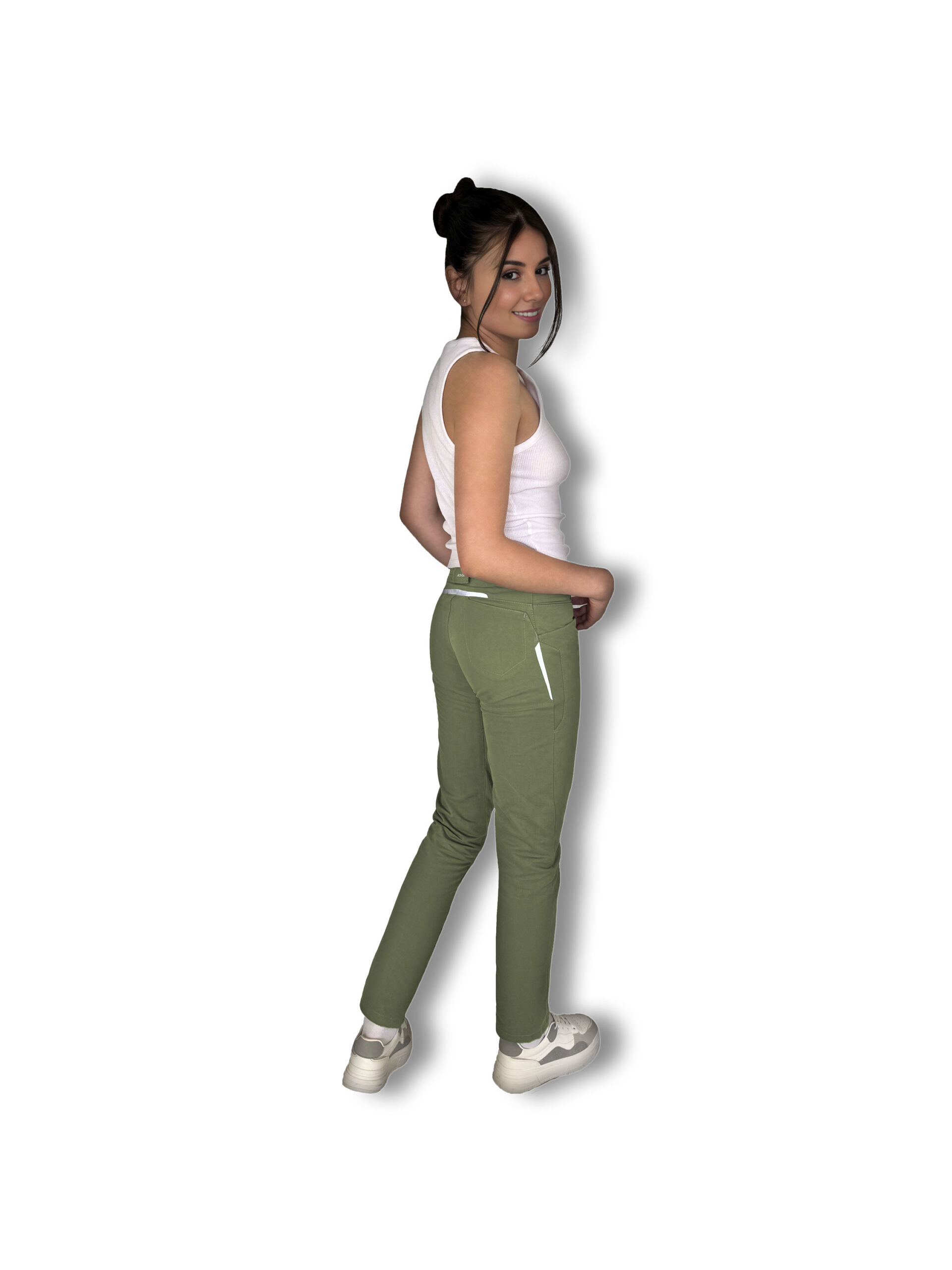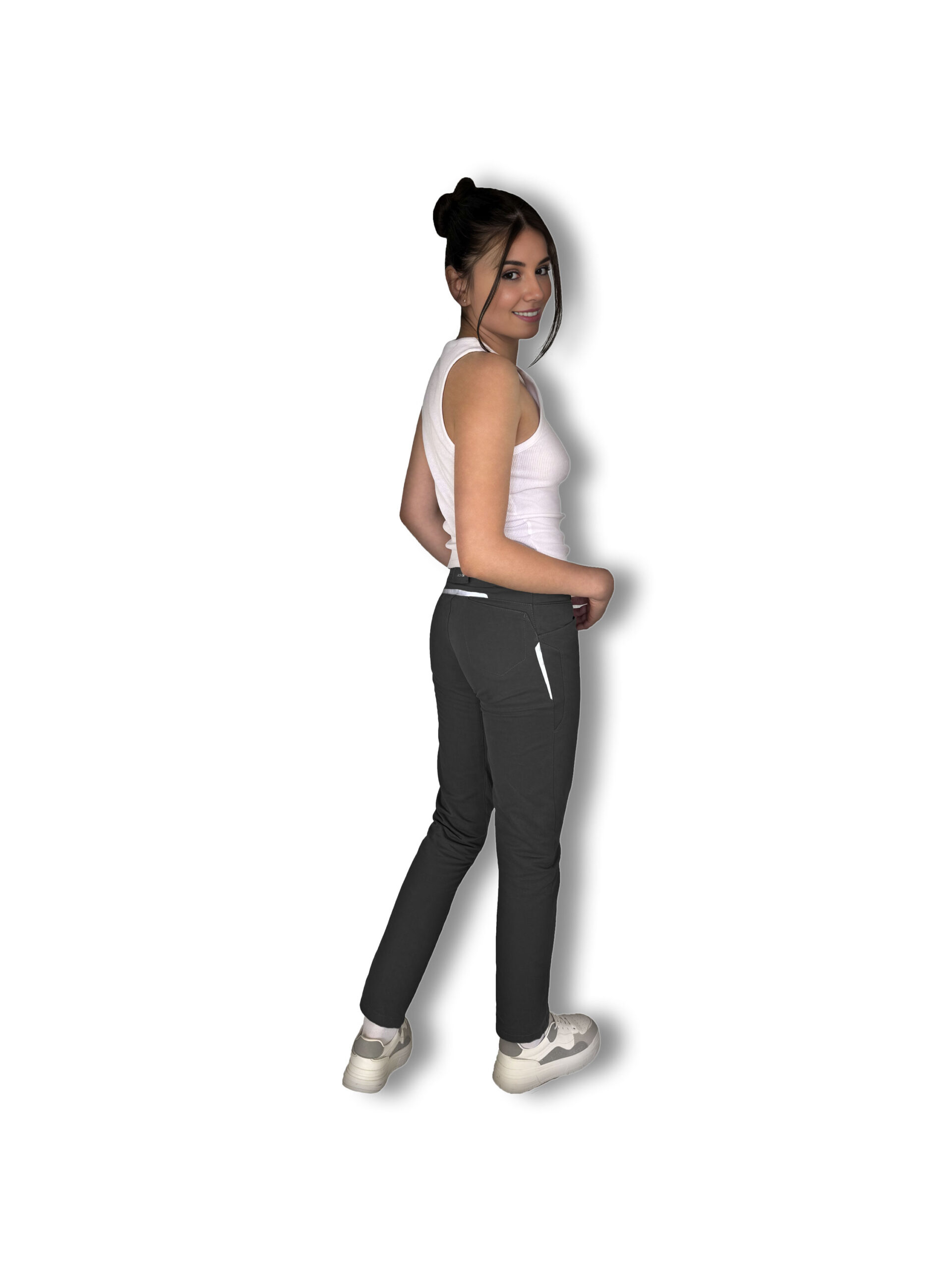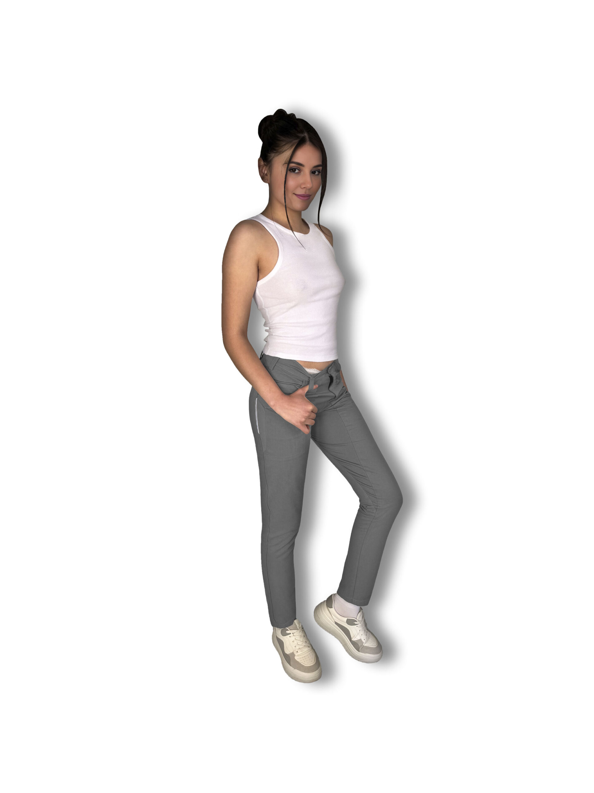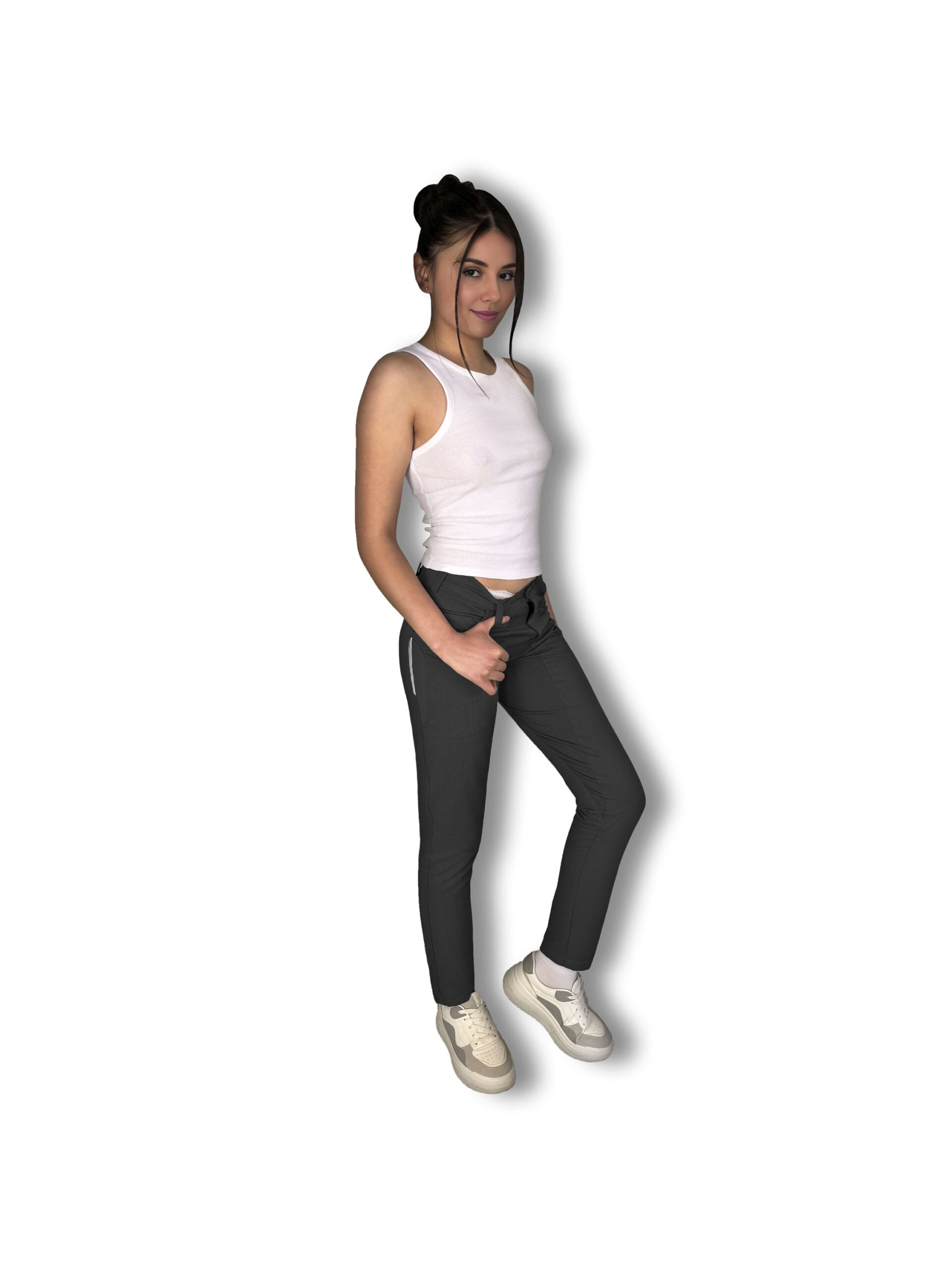 Pantaloni sunt creați folosind tehnologia FlexGroin, oferind un confort deosebit în combinație cu un material 100% bumbac, care își păstrează forma. Eleganța stilului subliniază silueta și frumusețea formei corpului, fără a crea disconfort sau a strânge, oferind senzația că porți pantaloni sport. Stilul sever, dar reținut al pantalonilor se potrivește atât pentru purtarea zilnică, cât și pentru întâlniri oficiale. Pantaloni sunt compuși din 85% bumbac, care nu cauzează reacții alergice ale pielii, și 15% poliester special hipoalergenic, utilizat exclusiv pentru a crea elasticitatea produsului.